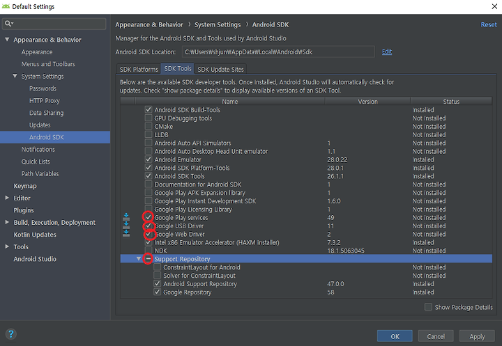 안드로이드 개발/부스트코스(안드로이드 프로그래밍) 개발도구 설치하기 개발일기 2019. 1. 3. 18:51 반응형 도구 설치하기우리는 앱을 만들기 위해 안드로이드 스튜디오라는 도구를 사용할 겁니다.이 도구는 안드로이드 개발자 사이트(http://developer.android.com/studio/index.html)에서 다운로드한 후 설치할 수 있습니다.무료이고 설치 과정도 그리 어렵지 않습니다.설치 파일을 클릭하고 순서대로 따라가면서 설치하면 됩니다.안드로이드 스튜디오 설치 화면설치를 마친 이후 프로그램 처음 실행했을 때 추가로 설치하는 과정이 있습니다.필요한 파일이 더 있기 때문인데요, 무언가를 선택하는 과정이 없기 때문에 따라가면서 추가 설치를 진행하면 됩니다.추가 설치를 위해 뜨는 화면최신버전 업데이트[Configure > Check for update] 메뉴추가 설치가 끝나면 한 가지 과정이 더 있습니다. ^^안드로이드 스튜디오를 실행한 후 시작 화면이 뜨면 하단의 [Configure > SDK Manager] 메뉴를 누르고 추가 구성요소를 설치해주세요.밑에 체크되잇는부분 모두 활성화!추가 구성요소 설치를 위한 화면설치되는 폴더들c->Programfiles->android사용자계정폴더-> .android사용자계정폴더-> appdata->local->android삭제시 세폴더 다 삭제해야됨bios설정 필요할수도 있음따라 하면서 설치하면 되는 과정이긴 하지만 몇 번의 설치 과정이 나누어져 있어 조금은 복잡해 보이죠?안드로이드 스튜디오는 자주 업데이트되기도 합니다.업데이트가 필요할 때는 Stable, Beta 버전 등으로 업데이트할 수 있는데, Stable 버전을 기준으로 최신 버전을 사용하면 됩니다. 안드로이드 개발자 사이트 (다운)http://developer.android.com/studio/index.htmlDo it! 안드로이드 앱 프로그래밍http://book.naver.com/bookdb/book_detail.nhn?bid=13272675 반응형