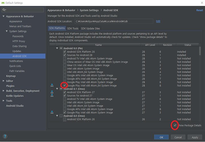 추가 구성요소 설치를 위한 화면설치되는 폴더들c->Programfiles->android사용자계정폴더-> .android사용자계정폴더-> appdata->local->android삭제시 세폴더 다 삭제해야됨bios설정 필요할수도 있음